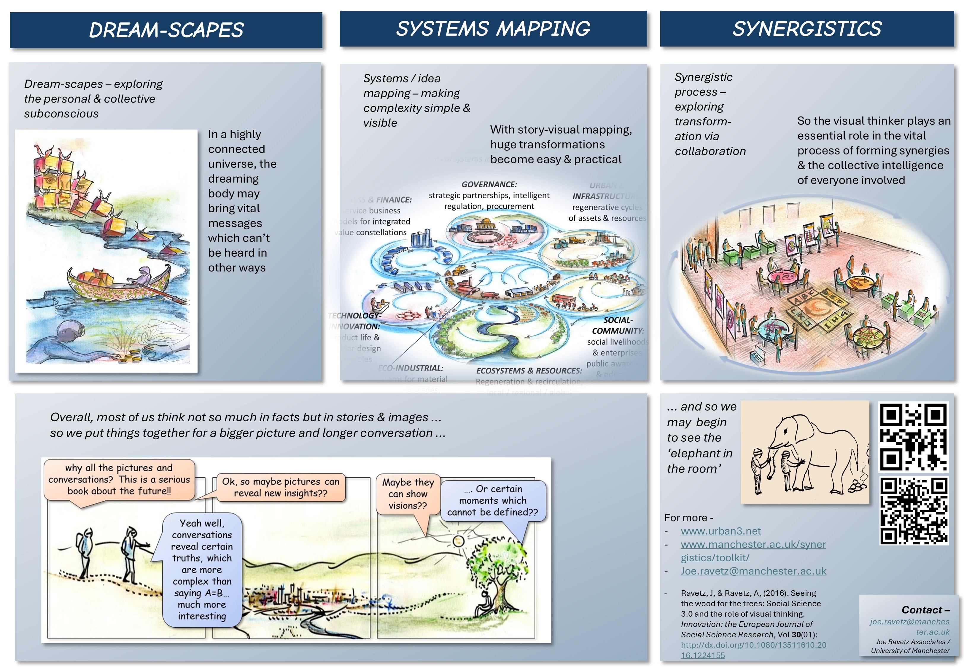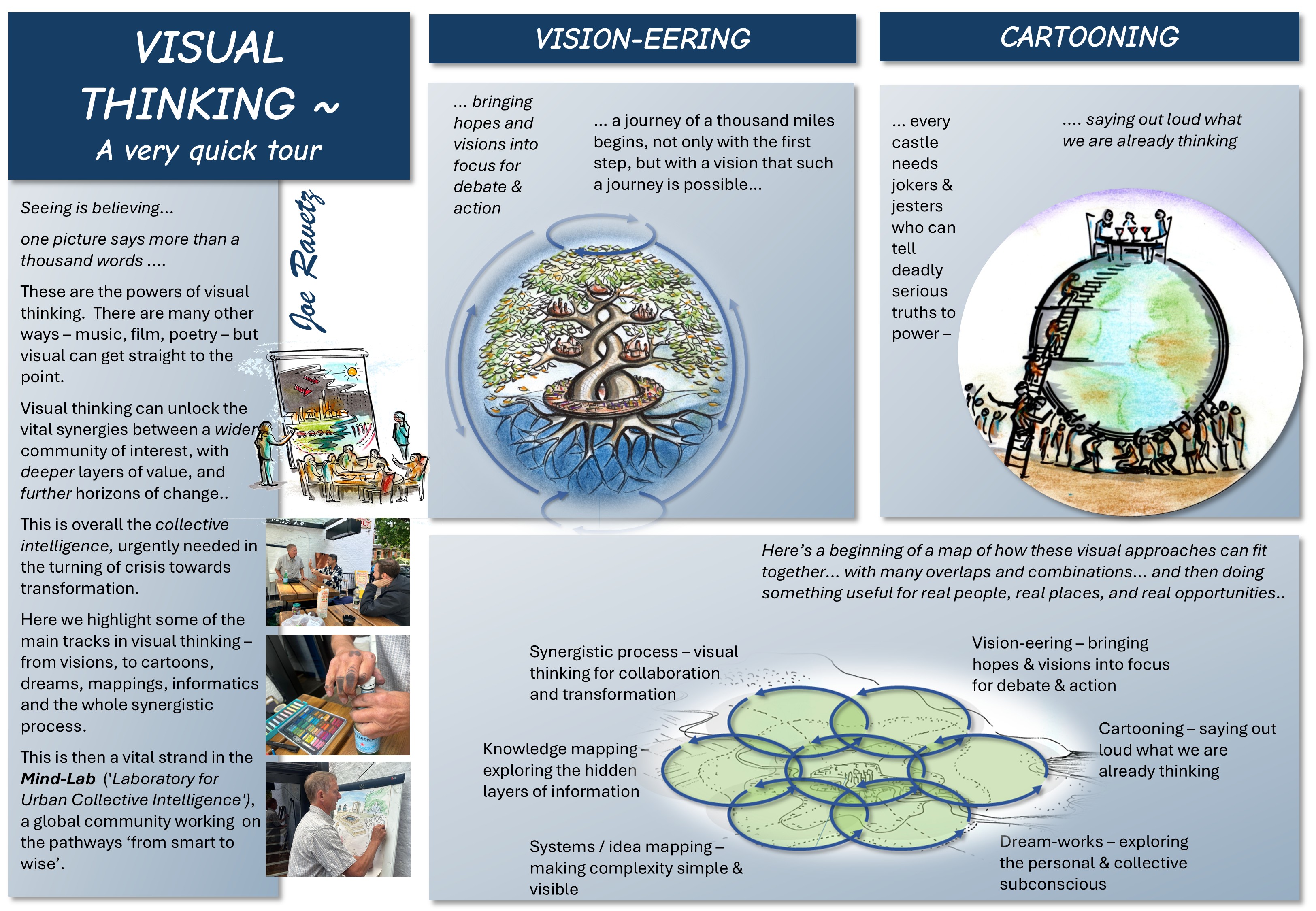 Here we highlight some of the main tracks in visual thinking – from visions, to cartoons, dreams, mappings, informatics and the whole synergistic process. This is then a vital strand in the Mind-Lab (‘Laboratory for Urban Collective Intelligence’), a global community working on the pathways ‘from smart to wise’.