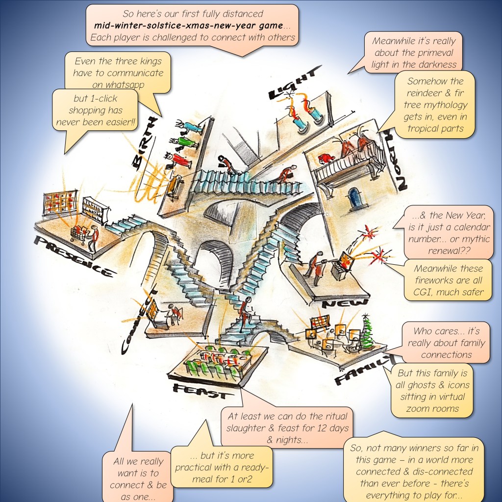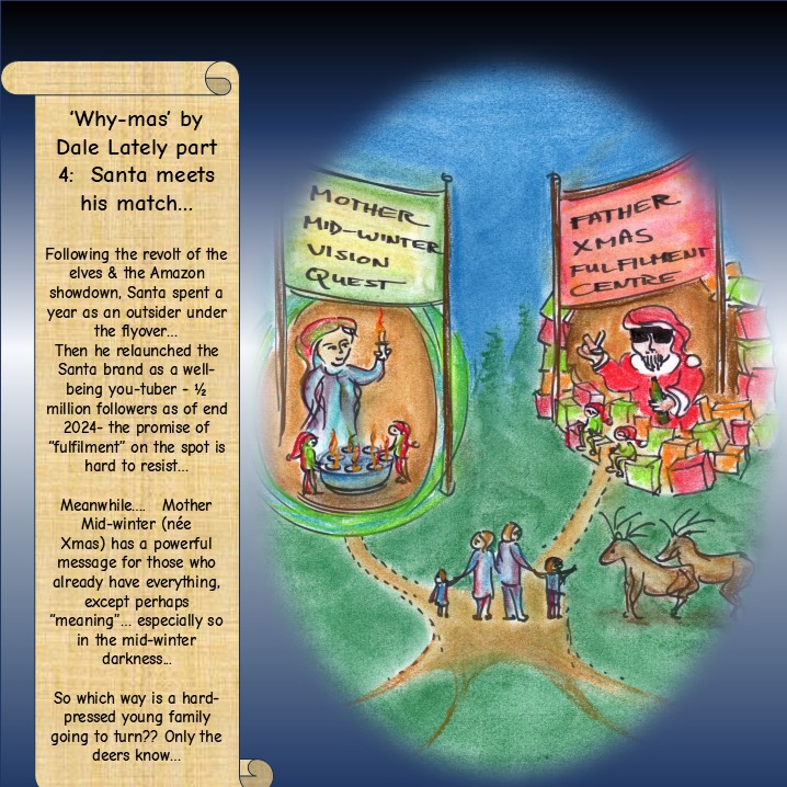 It seems Santa could be in his last throes of stardom… while starring in his new found roles as well-being you-tuber hosting his own ‘Fulfilment Centre’…. Meanwhile there is a powerful new force emanating from Mother Mid-Winter (née Mrs Xmas) and her followers, with messages of eco-feminist emancipation and the ‘journey of the inner elf’, way beyond base material desires…