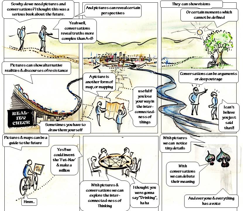 Conversations and dialogues, as with Plato in the 4th century BC, are the key to exploring complex inter-connected problems and opportunities. The ‘visual conversations’ here are ongoing experiments, from 2 decades of drawing: scenarios and visions, complex problems, dreams and aspirations.